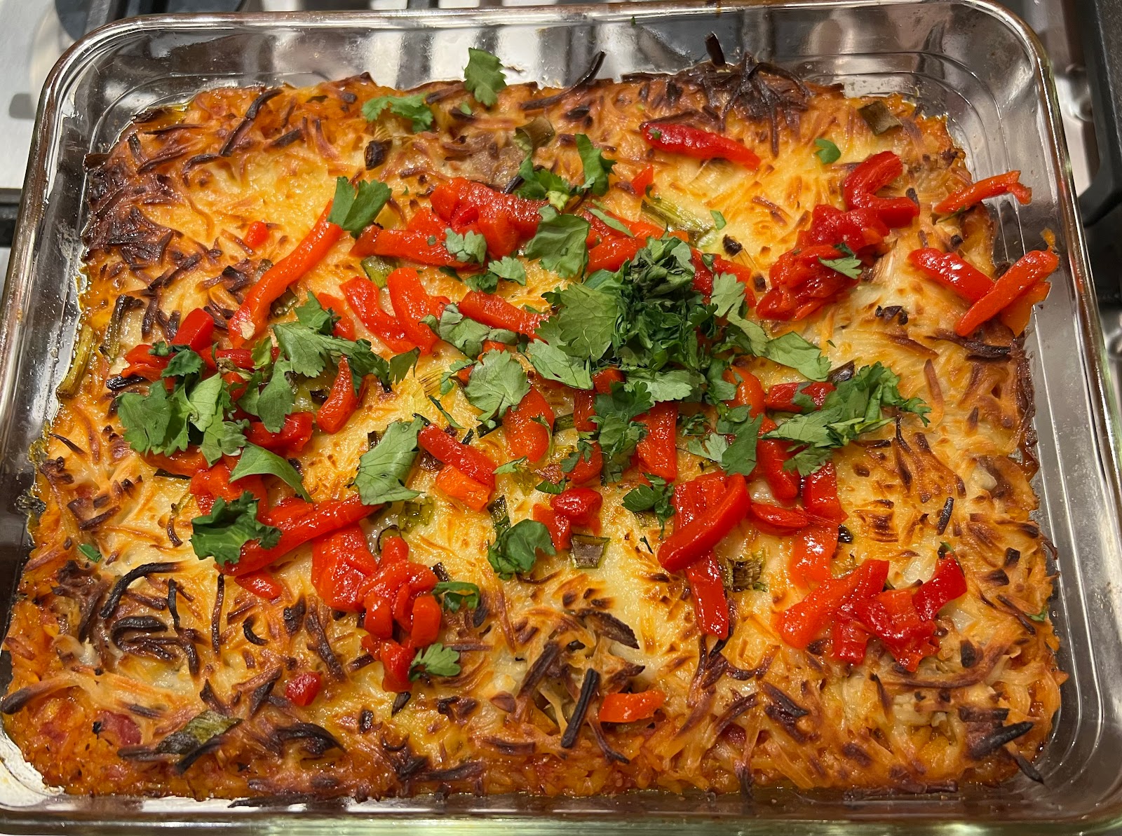 BAKE COVERED FOR 45 MINUTES. UNCOVER FOR 15 MINUTES. BROIL 5-10 (UNTIL PRETTY) LET SIT FOR HALF HOUR.